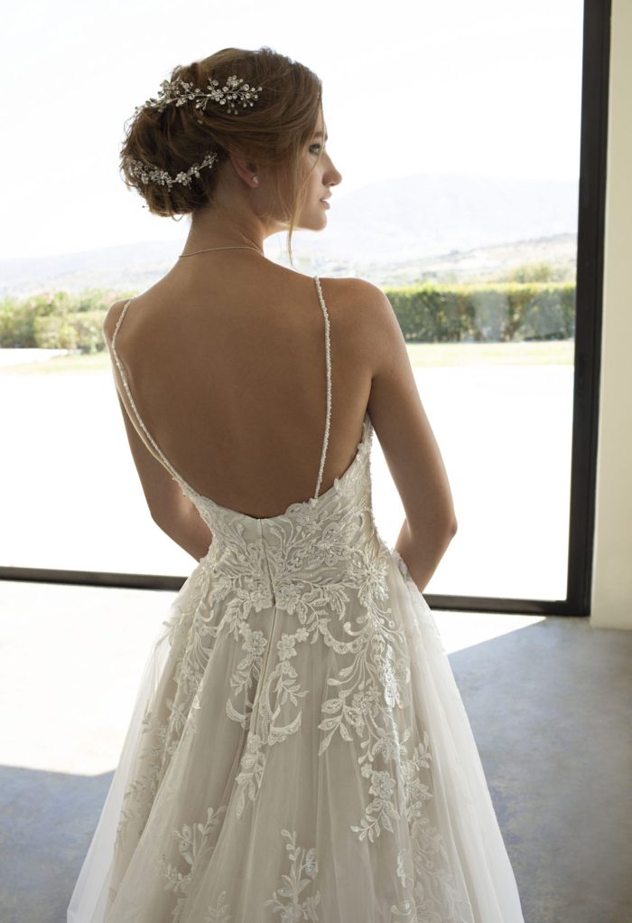 This plunging v-neckline soft chiffon gown features a cross over back and ruched bodice. Finished with a simple chapel length train.