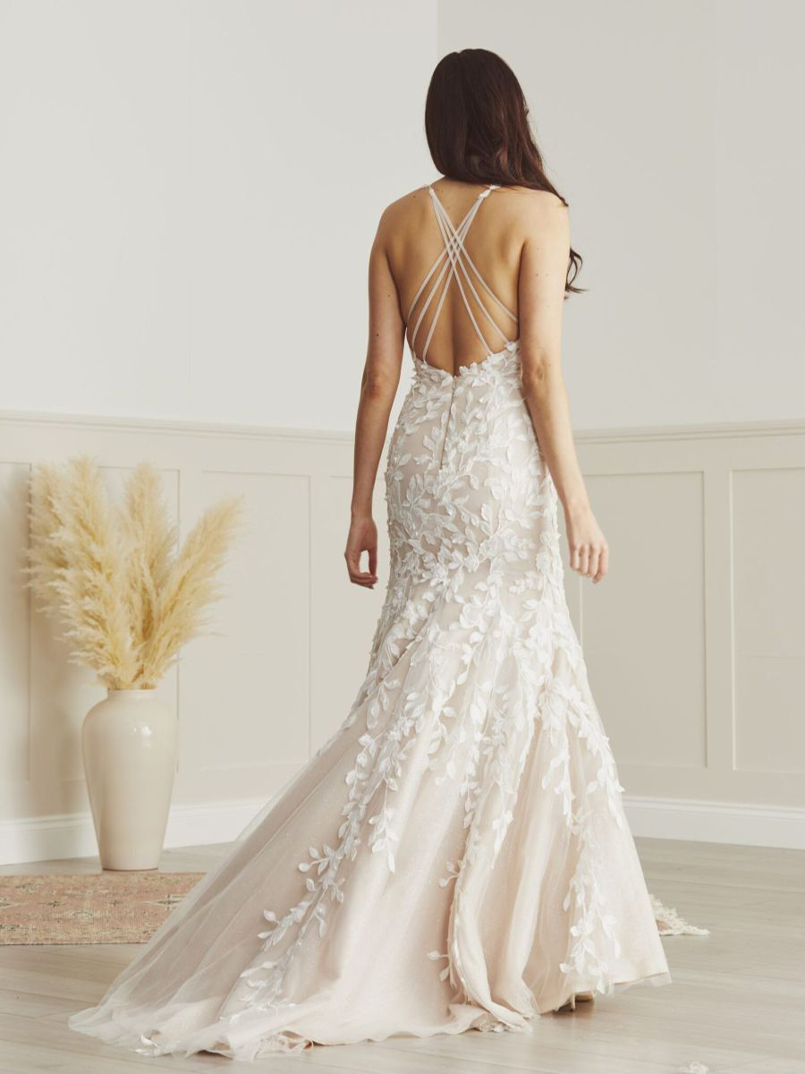 A soft fishtail style dress featuring delicate lace appliques and subtle shimmer. A plunging sweetheart neckline and intricate cross over back design.